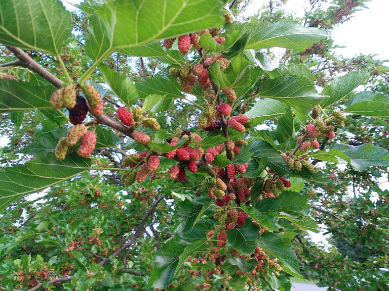 Imagine black raspberries growing on trees, and you start to appreciate the wonders of the mulberry tree. Early ripening fruit is a special way to start the fruit season. Young leaves are very high in protein.