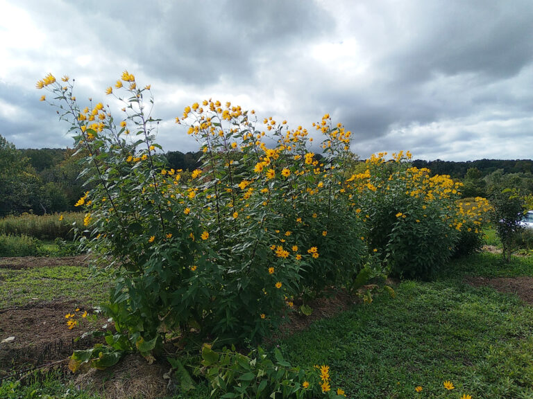 Stunning sunflowers with edible potato sized tubers! A great source of calories for little work up front. Prefers to be dug as often as possible. Aggressive spreader, but can be mowed to be contained.